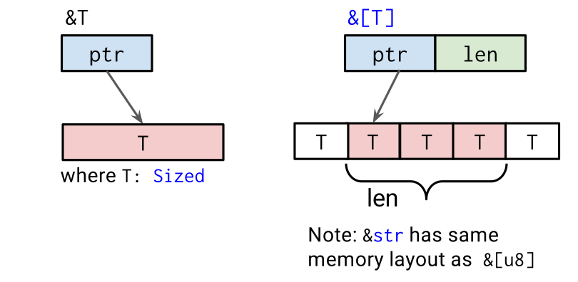 - Reference-а в този случай е "fat pointer", който държи не само указател, но и размера на парчето данни, което има този тип.